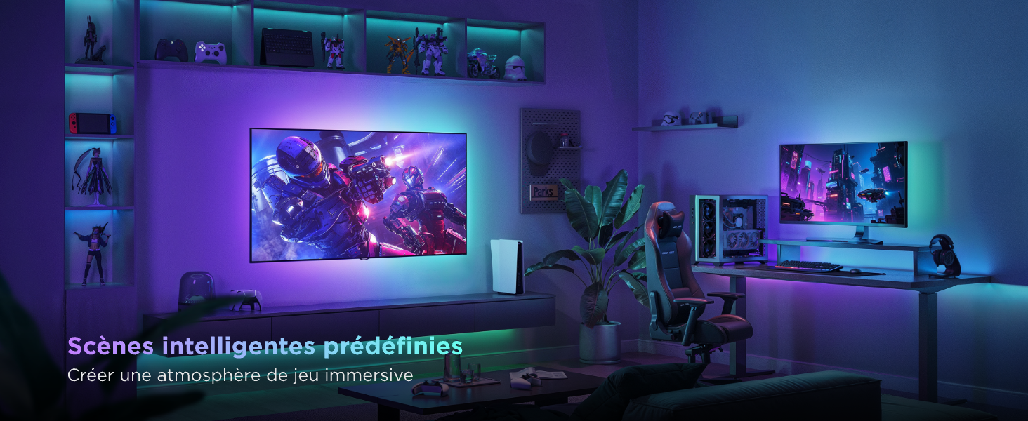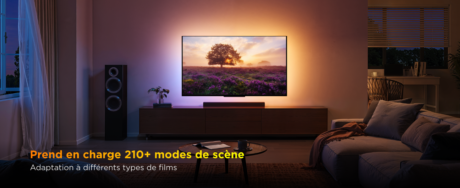 Possibilités Créatives : - 210+ Modes Intelligent : Découvrez l’ambiance immersive avec des modes d’éclairage adaptés aux films, jeux et musiques. - Détection Automatique des Scènes : Des effets synchronisés en temps réel avec l’écran pour une expérience filmique ultime.