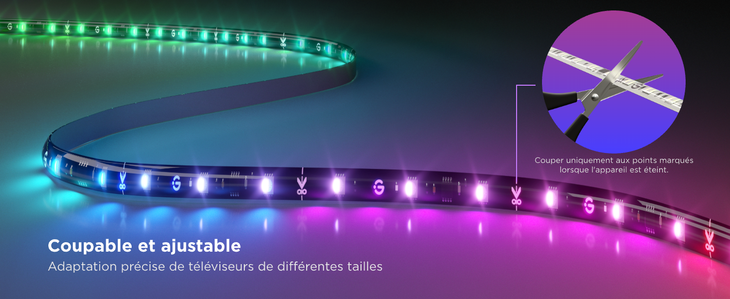 Précisions : - Coupes Sécurisées : La section entre les symboles de ciseaux sur la bande LED représente un circuit complet. Coupez uniquement au niveau ou juste après ces symboles. - Prenez Garde : Tout coup d’œuvre à d'autres endroits endommagerait le circuit et empêcherait d'éclairer la bande entière.