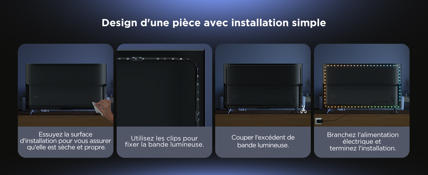 Instructions Pratiques : - Bandelette TV Unique : Avec des clips de fixation innovants, l’installation est simpe. Collez-la simplement à l’arrière de votre téléviseur pour un ajustement parfait. - Sans Outils Nécessaires : Une installation sans tracas idéale pour les débutants.