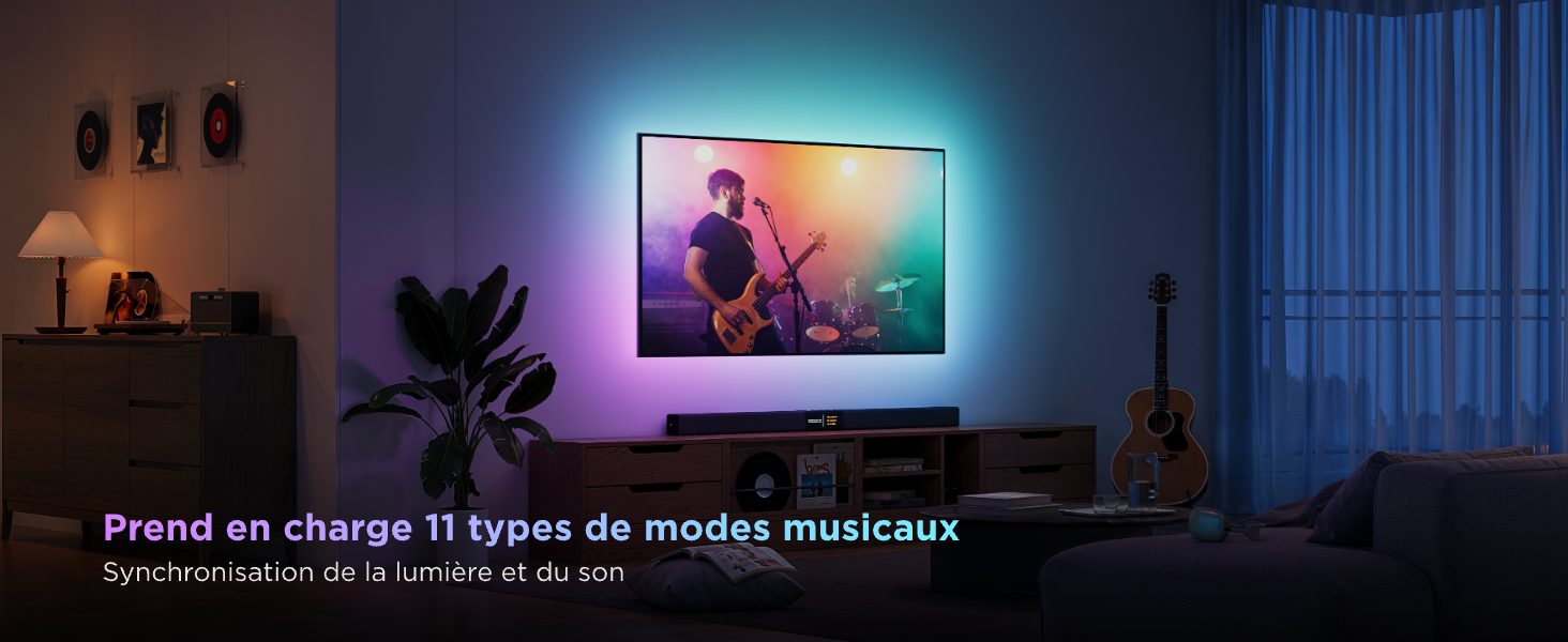 Expérience Immersive : - 11 Modes : Découvrez la danse lumineuse de vos lumières en temps réel avec votre musique ou vos films via l’app. - Captation Audio : Parfaitement synchro lumière / son pour une immersion totale.